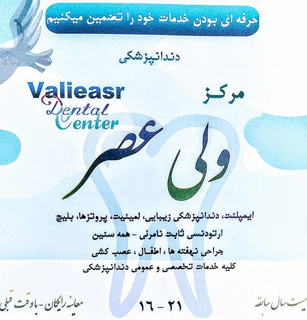 دندانپزشکی خانواده ایرانی کد مرکز : — تلفن : 36604200-021 آدرس : تهران، پیروزی، سه راه سلیمانیه، جنب پمپ بنزین، کوچه مشایخی، طبقه فوقانی بانک