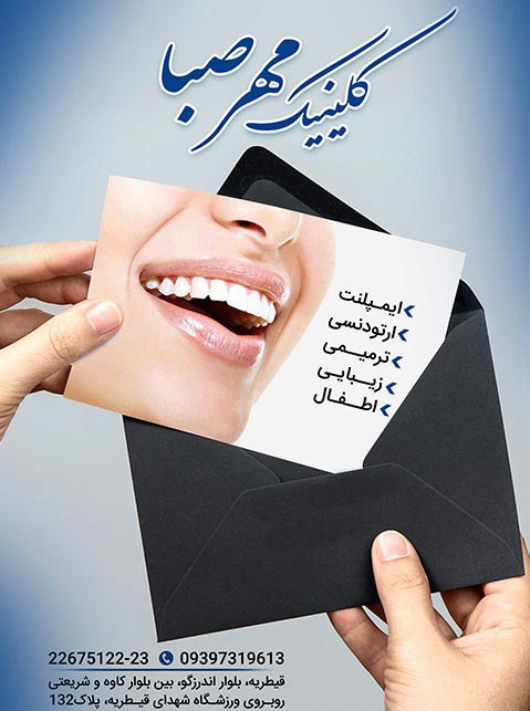 دندانپزشکی مهر صبا کد مرکز : — تلفن : 22675123-021 / 22675122-021 آدرس : تهران، قیطریه، بلوار اندرزگو، بین بلوار کاوه و شریعتی، روبروی ورزشگاه